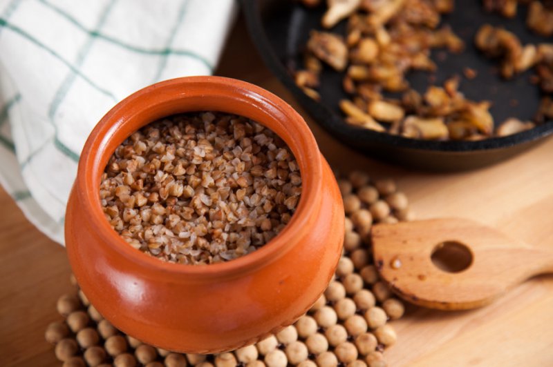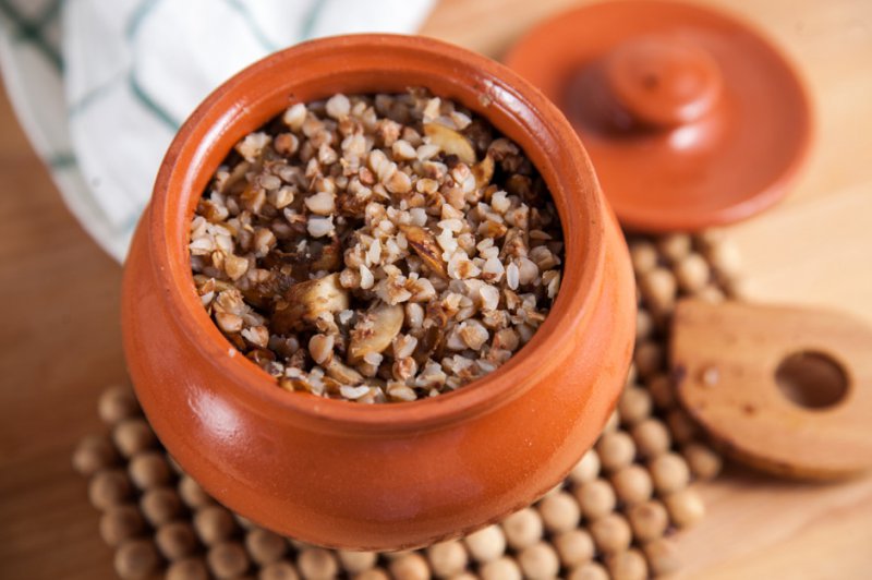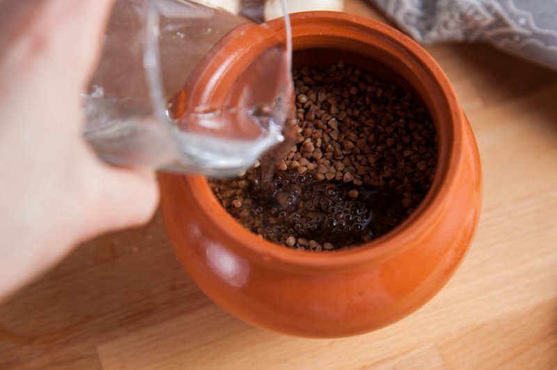 В глиняный горшочек всыпать крупу, залить только что вскипяченной водой, посолить, накрыть крышкой и отправить в предварительно нагретую до 220 градусов духовку.
