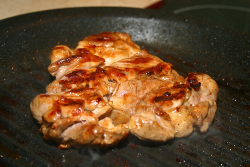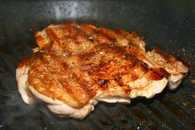 Если отбивная сохранила посторонние запахи птицефабрики, ее можно замариновать на пару часов. Тут есть поле для фантазии, но я, как правило, ограничиваюсь солью, перцем и чабером. Уместно плеснуть немного оливкового масла и втереть его в мясо. Жарим на гриле, начиная со стороны кожи. Минуты по три-четыре с каждой, не больше. По готовности, оставляем отдохнуть минут на пять. Гурманы могут положить сверху немного сливочного масла.