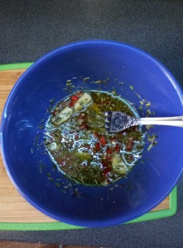 Теперь делаем маринад, для этого берем оливковое масло и смешиваем с цедрой лимона, чесноком, приправами, солью и перцем чили. Лучше конечно чтобы нога полежала в маринаде часа 2 - ночь.