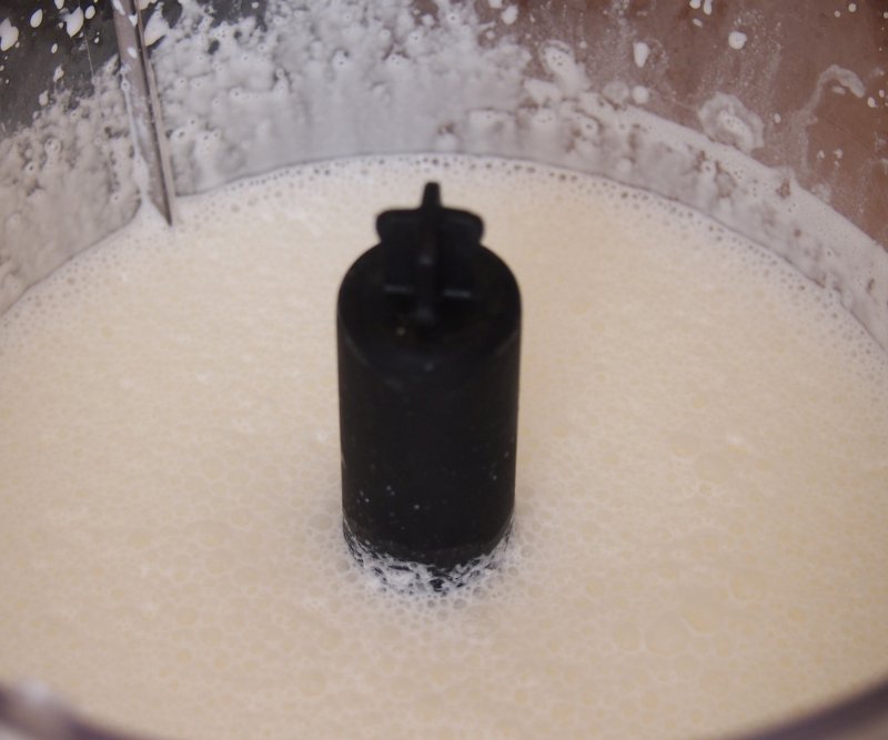 Сливки взбиваем обычным блендером, я даже поленилась взять специальную насадку для взбивания и взбивала прямо в емкости блендера ножом, который на дне. Прочитали в интернетах, что сливки и сама емкость должны быть охлажденными, поэтому перед взбиванием, мы поставили все это в морозилку ненадолго.
