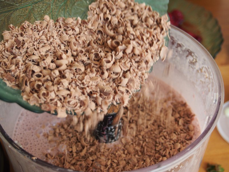 Захотелось добавить тертого шоколада. Уже потом мы поняли, что лучше было бы добавлять шоколад в уже полузастывшую в морозилке массу, иначе он весь оседает на дно, но тогда мы этого не знали.