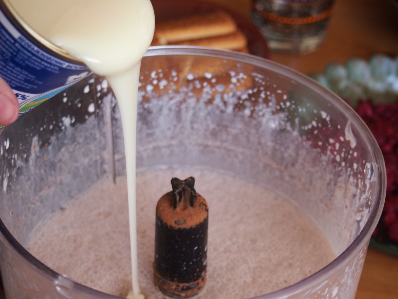 Потом вливаем сгущенку, постепенно, не переставая взбивать.