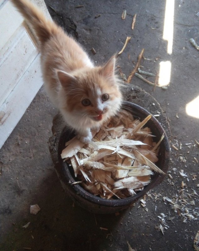 Как же без помощника! Опилок не было, настругал немного ольхи в емкость.