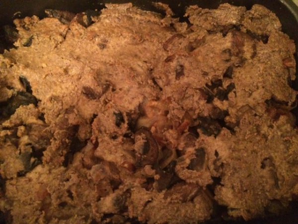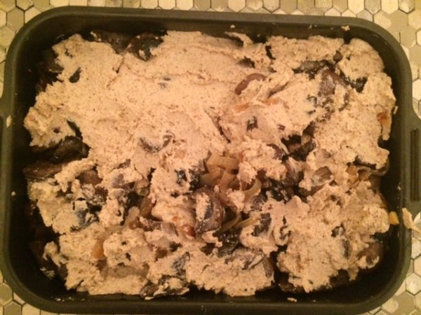 Теперь все это нужно аккуратно выложить в форму. Форму предварительно смазываем кусочком сливочного масла.