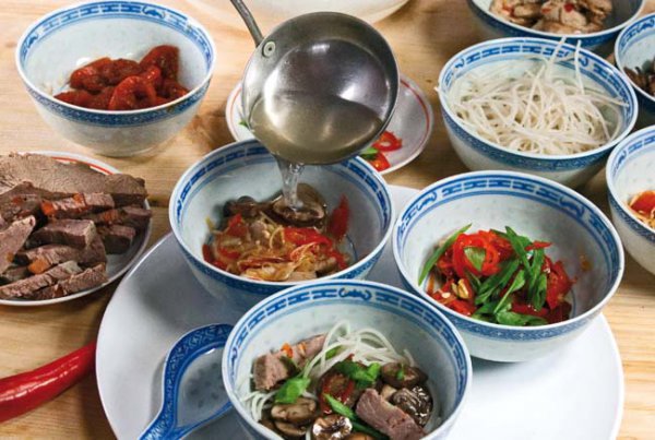 Когда заправки подготовлены к использованию, когда нарезано отваренное в бульоне мясо, когда зелень уже на столе, можно собственно, составлять сами супы - кому что и в каком сочетании нравится. Вот тут у меня на переднем плане - чашка супа с шампиньонами, отварной говядиной и рисовой лапшой. Справа - суп с исключительно чесночно-луково-перечной заправкой, приправленной кружочками острого перца и перышками зеленого лука. Слева - суп из помидоров и куриного филе с добавлением припущенного порея. Все это дело остается только залить кипящим бульоном и выправить на соль, которая всегда на столе.