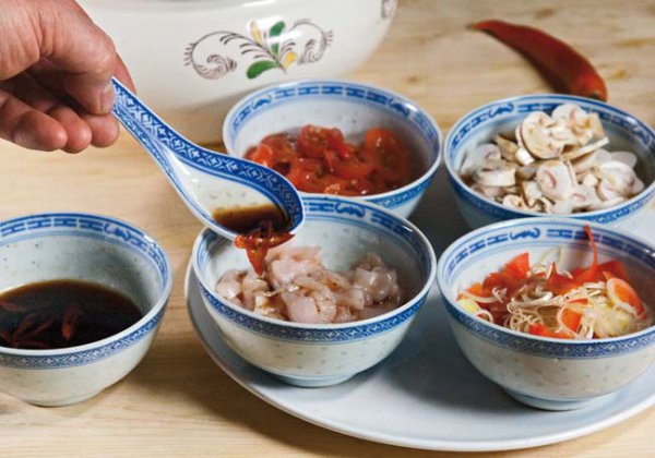 В качестве прочих компонентов будущих супов очень хорошо смотрятся лапша или рис, отваренные загодя, ну и, конечно, свежая зелень на собственный вкус.