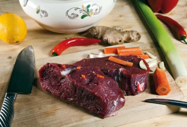 Поскольку говяжья мякоть в последующем может быть использована в качестве одного из компонентов супов, я варю на ней бульон следующим образом. Один или два крупных куска (за 3 литра воды примерно 600-700 граммов мякоти) предварительно и произвольно шпигую кусочками моркови и чеснока.