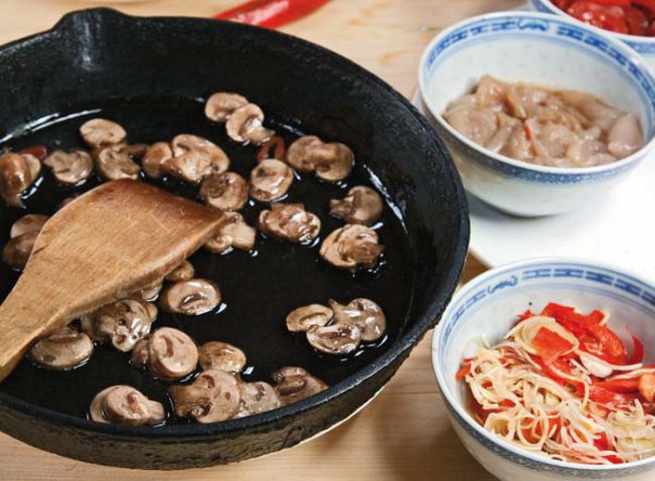 Припускаются заправки, с которых предварительно отжат маринад, в небольшом количестве разогретого растительного масла, как я уже говорил, не более 1-2 минут и возвращаются в ту же плошку, в которой они мариновались, предварительно освобожденную от остатков маринада. Если припускается мясо, рыба, морепродукты или птица, время тепловой обработки можно увеличить до 3-4 минут. Каждая последующая заправка припускается в остатках масла предыдущей заправки, но поскольку масло в любом случае остается в заправке, вот почему, если возвращаться к приготовлению бульона, важно, чтобы не использовалось жирное мясо или кости.
