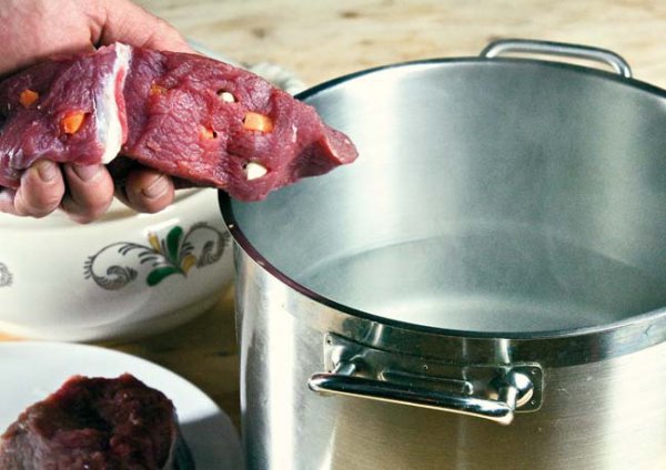 Нашпигованную овощами мякоть закладываю в кастрюлю с закипевшей водой, чтобы мясо умеренно оставило свои вкусы в бульоне и что-то сохранило в себе.