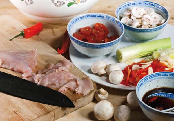 Что касается непосредственно заправок, они могут быть как однокомпонентные, так и многокомпонентные. Однако в само начале этих заметок я не случайно прибег к такому образу, как "суповой пазл". Думаю, этот образ подскажет каждому из вас, что абы как с абы чем в ходе приготовления заправок смешивать не стоит, поскольку суповой пазл может и не сойтись. Во всем нужна избирательность, увы. И если у вас возникают сомнения относительно сложения заправочных компонентов, лучше пойти по однокомпонентному пути, определив каждой заправке отдельную посуду. Единственное исключение можно сделать, скажем так, почти обязательной при прочих других, заправке, состоящей из тонко нарезанного порея, сладкого перца и чеснока - здесь довольно сложно промахнуться. Нарезанные ломтиками шампиньоны (если они используются, но лучше их использовать), помидоры (если используются), морепродукты или тонко нарезанное говяжье филе (если используются), куриное филе (на нижнем снимке) лучше мариновать отдельно.