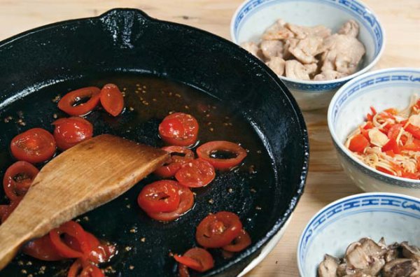 Наконец, если в качестве заправки используются помидоры, их лучше всего припускать в самую последнюю очередь, чтобы появившимся соком деглазировать сковородку. То бишь, "снять" с нее вкусы, оставленные ранее припущенными продуктами.