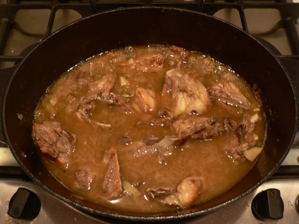 Когда жидкость закипела, убираем огонь в минимум и прикрываем крышкой. Всё, пусть тушится до готовности. А время зависит от качества мяса, тут уж не попишешь.