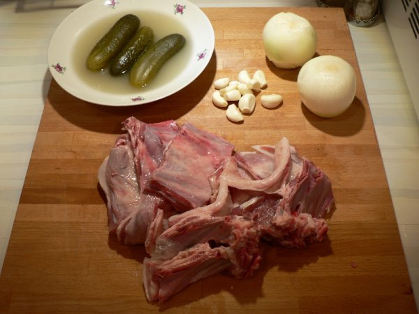 Раз уж я прыгал с фотоаппаратом вместо того, чтобы спокойно готовить, выложу и второй рецепт, заснятый этой зимой. И на этом успокоюсь. Любите ли вы солёные огурцы, так как люблю их я? А рассольничек с перловкой? А бараньи ребрышки?