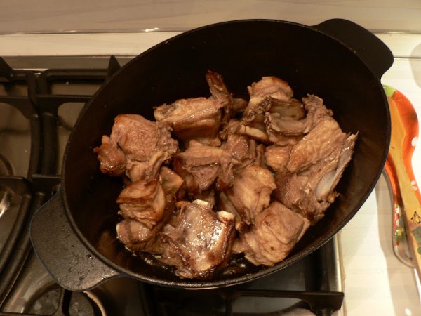 Берём казан или утятницу (у меня чугунная утятница), наливаем/кладем масло/жир (у меня с недавних пор всегда под рукой вытопленый утиный жир - рекомендую. Благо курдюка в наших краях всё одно не сыщешь) и на сильном огне обжариваем куски мяса.