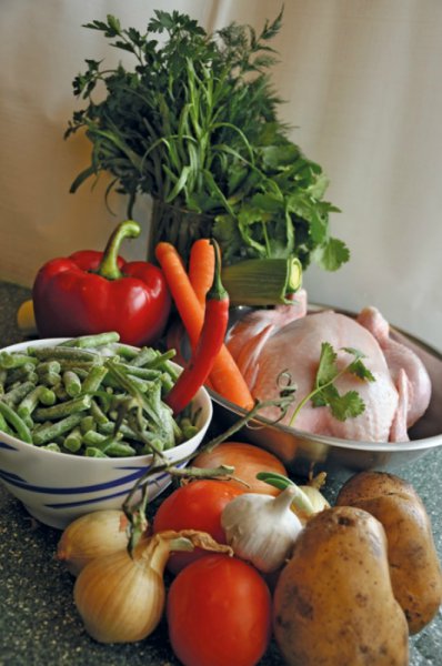 Не ожидая никаких откровений, я нарубила кусками курицу, нарезала тонкими полукольцами 6 головок репчатого лука, колечками 3 тоненькие морковки, как придется порубила два помидора, крупными тругольниками порезала красный перец, раздавила 6 зубчиков чеснока, нарезала зелень кинзы, петрушки, тархуна, укропа. Фасоль достала из морозильника, проверила острый перец - нет ли у него изъянов.