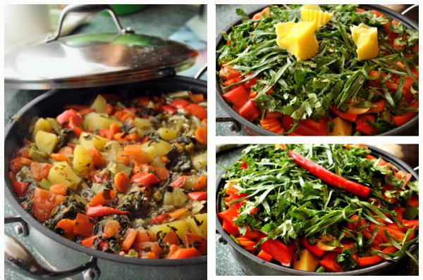 Настроение уже заметно лучше. Осталось выложить зелень, хороший кусок топленого масла и стручок остого перца. Да, еще хотелось бы сюда добавить алычи, но ее у меня нет, поэтому я добавлю 1 ч.л. виннного уксуса. Теперь нужно накрыть кастрюлю крышкой, разогреть кастрюлю так, чтобы крышка стала горячей, снизить огонь до малого среднего и можно смело оставить блюдо тушиться безо всякого присмотра часа на полтора. Оно само даст о себе знать. Вначале вы почувствуете слабый незнакомый аромат - ничего подобного за всю зиму вы не слышали! А потом все сильнее и сильнее, пока головокружительный запах не пригонит вас на кухню проверять - не готова ли ваша затея.
