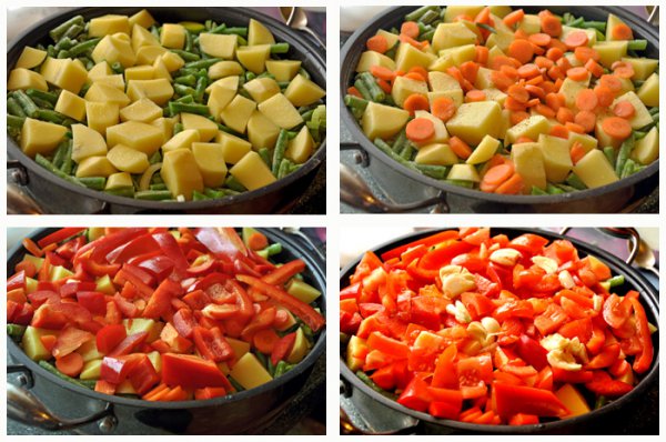 Далее последовали четыре картофелины, нарезанные небольшими кубиками, морковь, слой перца и помидоров. Чеснок! Не забыть раздавленный чеснок выложить сверху. Опять посолить и поперчить, посыпать чуть-чуть хмели сунели.