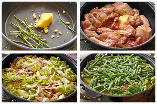 На большую глубокую сковороду выложила большой кусок топленого масла и разложила одним слоем курицу. Посолила, поперчила, посыпала хмели-сунели. На курицу положила слой нарезанного лука, а на него - зеленую фасоль.