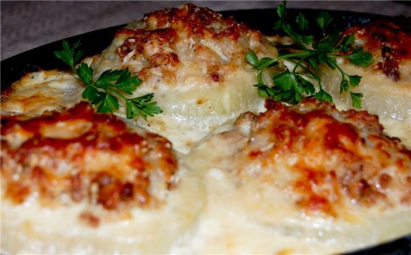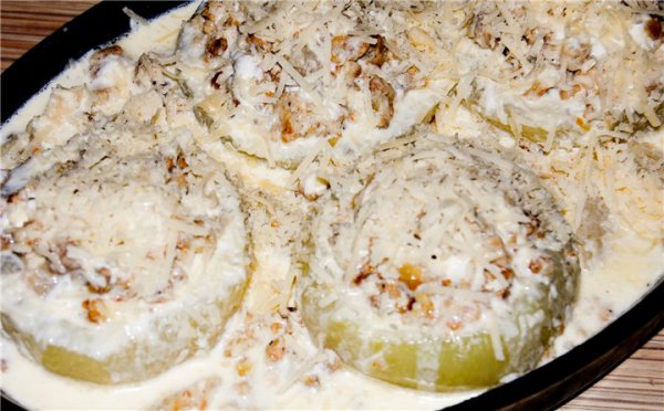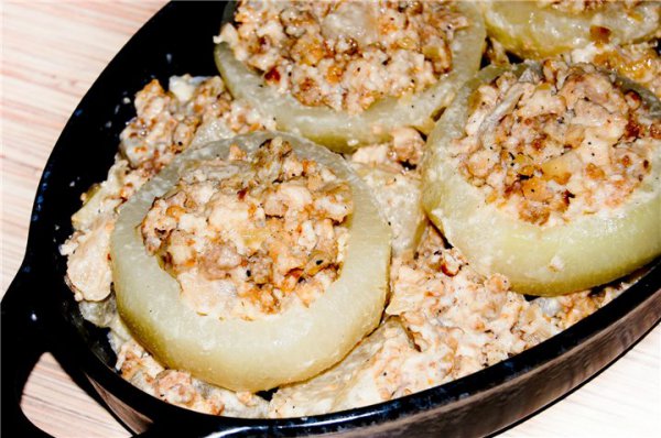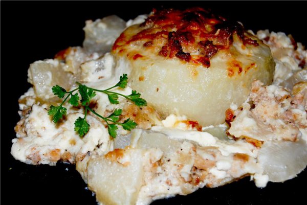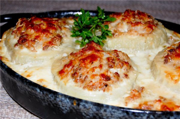 Поверхность посуды, в которой будем запекать, смазать маслом, уложить кольраби и заполнить пространство между ними оставшимся фаршем.