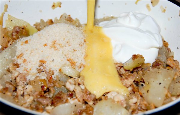 Снять с огня, добавить 2 ст. л. сметаны, взбитое яйцо, сухари, перемешать. Наполнить чашки из кольраби фаршем.