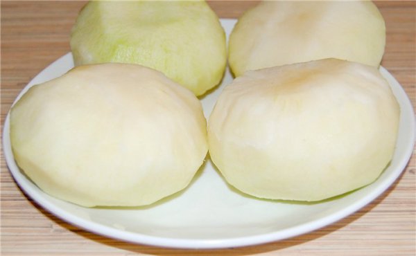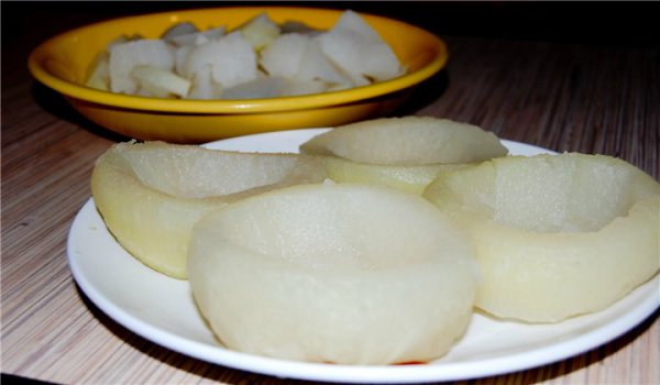 Срезать верхушку ¼ часть. Ложечкой, ножиком вынуть серединку - сделать чашечки с толщиной стенок 6-7 мм. Извлечённую мякоть и срезанную часть порезать на кусочки.
