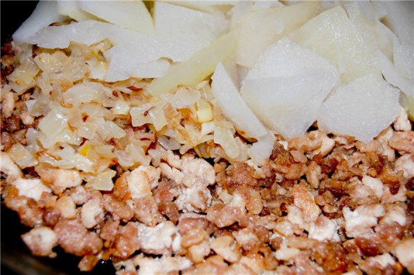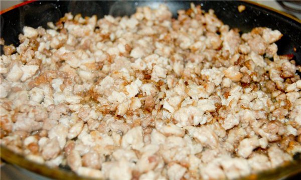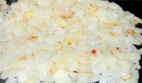 Лук очистить и мелко нарезать. Обжарить до румянца.