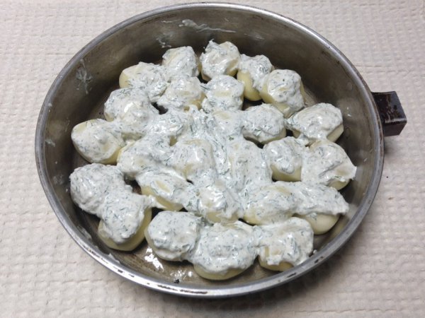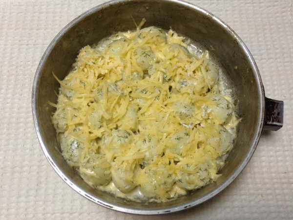 Картофель сверху полить соусом и поставить в духовку, разогретую до 180 градусов, на 30 минут.