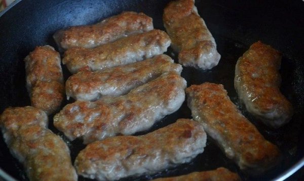 Сковороду разогреть с растительным маслом (масло должно полностью покрывать дно сковороды), выложить мясные колбаски и обжарить с двух сторон до красивого румяного цвета.