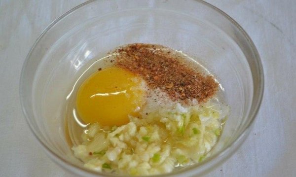 В отдельную тарелку вбить яйцо, добавить соль, чёрный молотый перец, приправу к мясу и пропущенный через пресс чеснок, хорошо перемешать с помощью вилки.