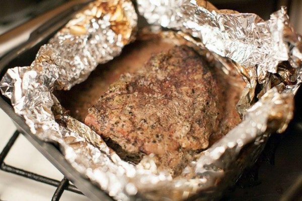 Отправляем в разогретую до 180 градусов духовку на час. Затем достаем, аккуратно открываем фольгу (осторожно, горячий пар!) и снова в духовку на 10 минут. Если есть гриль - идеально!