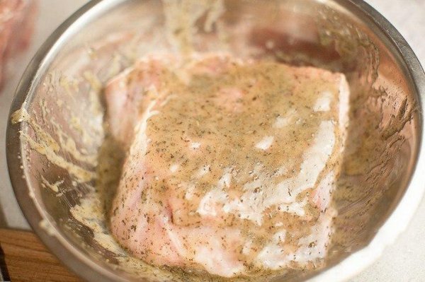 Кладем мясо в миску и обмазываем маринадом со всех сторон. Если у вас есть возможность, убираем на ночь в холодильник, если нет - то пусть час стоит при комнатной температуре.