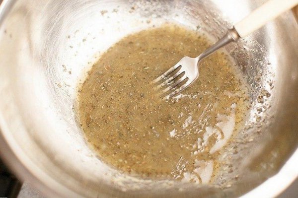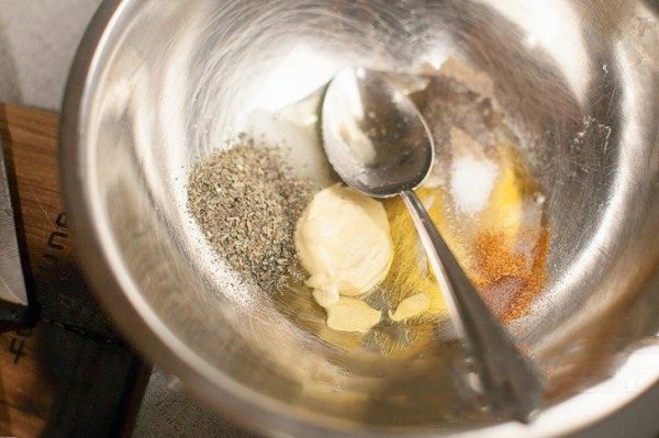 В миске смешиваем оливковое масло, мед, горчицу и все специи.