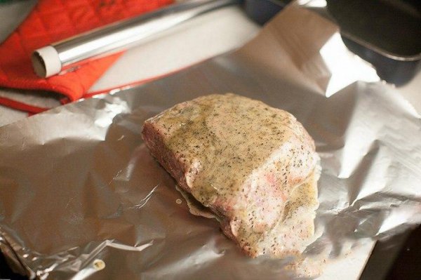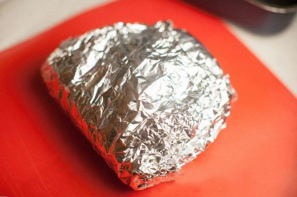 Затем кладем 2 листа фольги и заворачиваем в нее мясо.