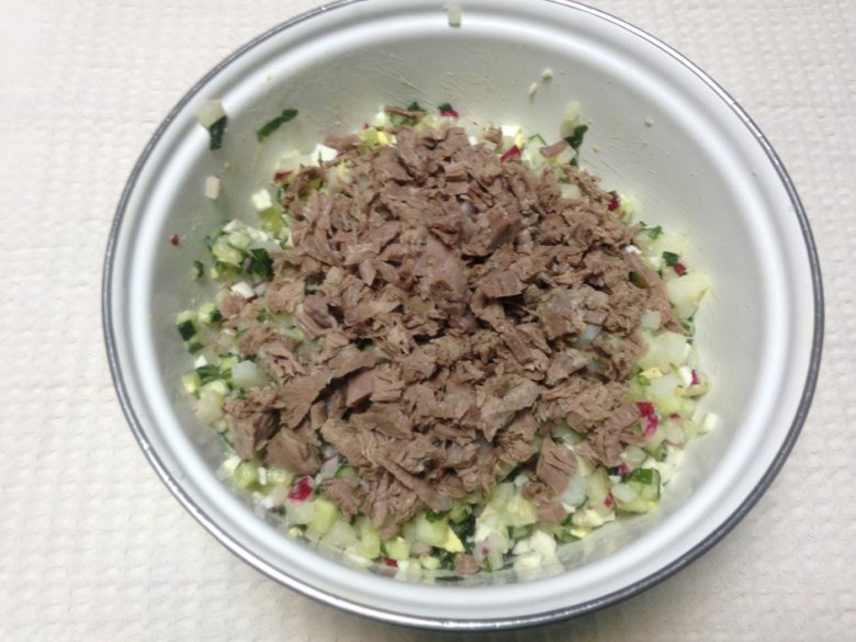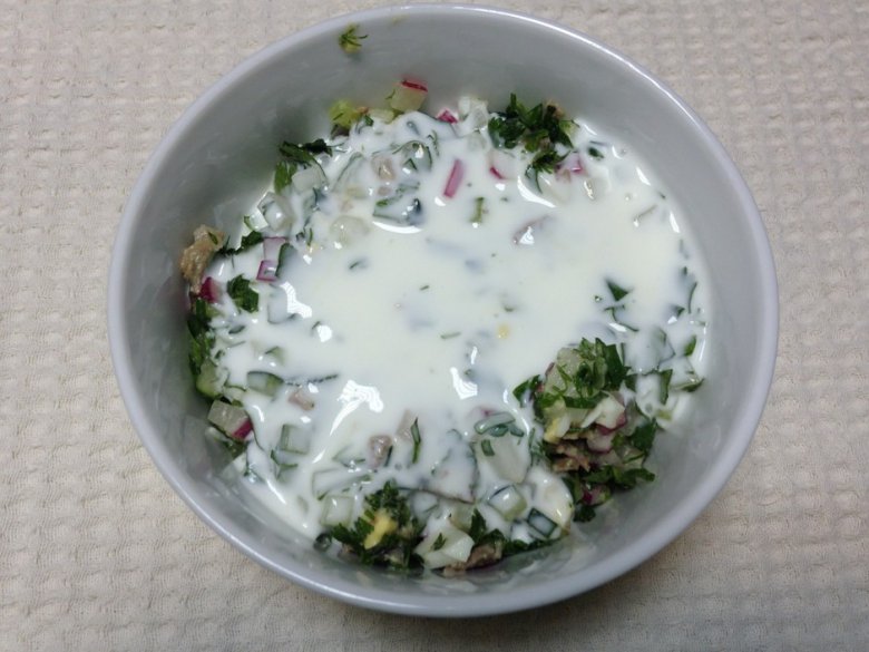 Все перемешать и украсить листьями мяты. Освежающая и витаминная окрошка готова!