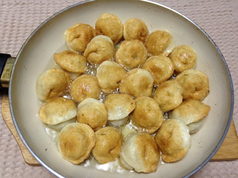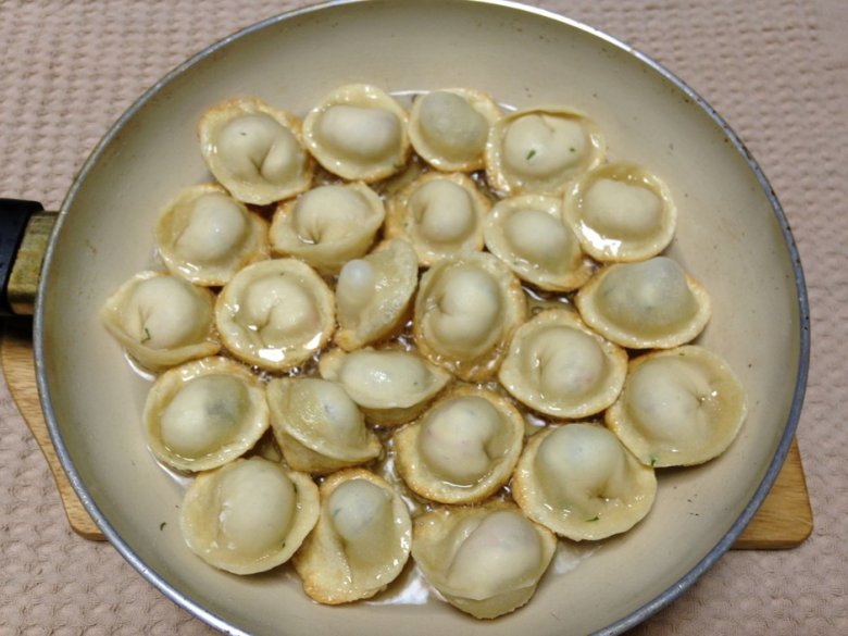 Пожарить пельмени с двух сторон до золотистого цвета.