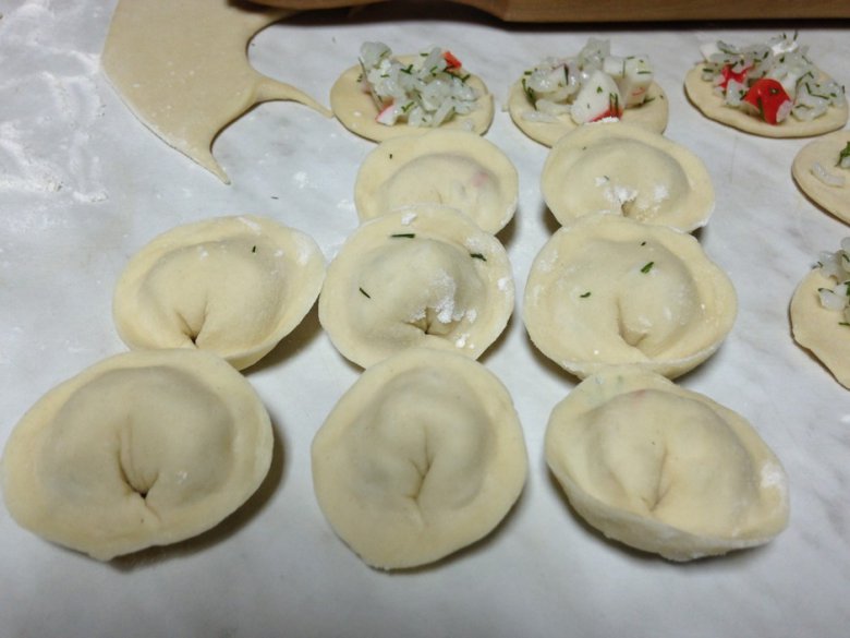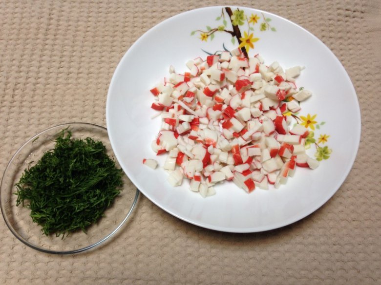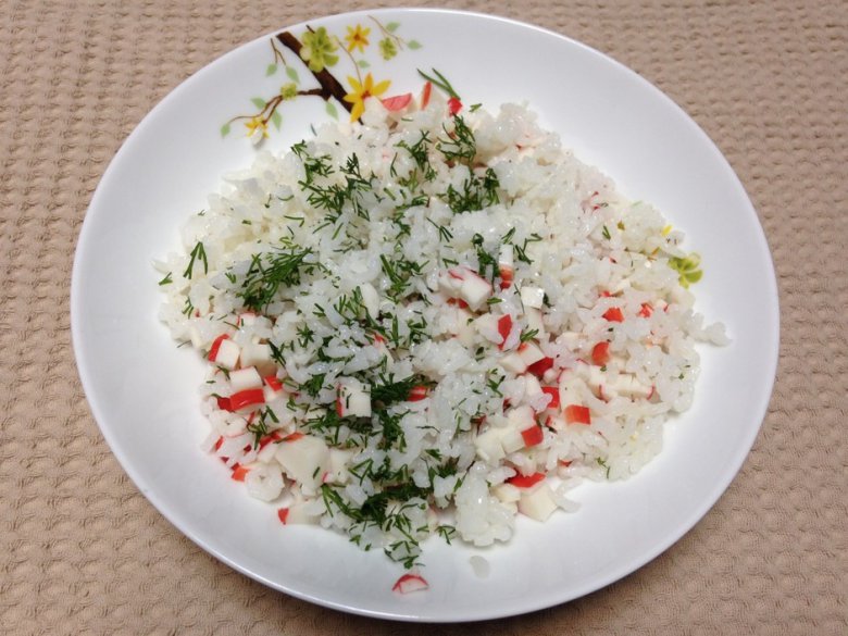 Сделать начинку для пельменей: рис, крабовые палочки и укроп перемешать, посолить.
