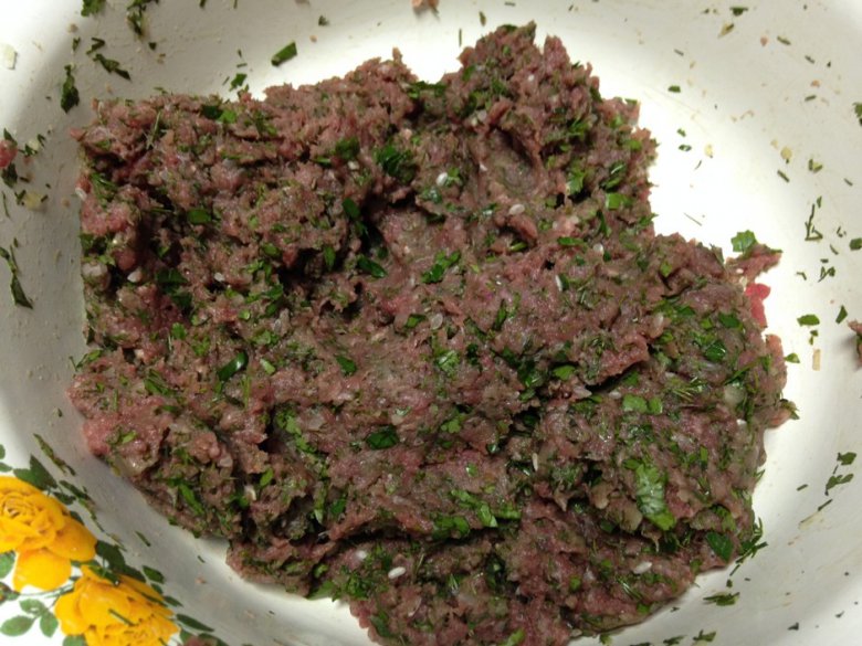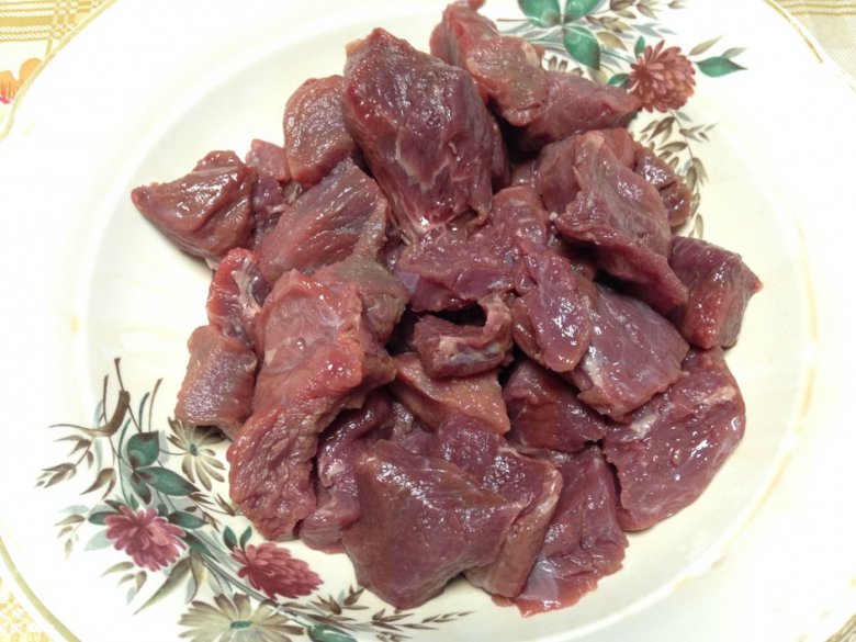 Говядину порезать на кусочки. Убрать весь жир и жилы. Пропустить через мясорубку.