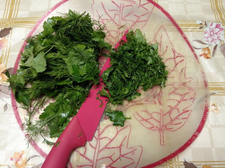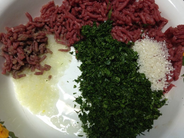 Лук пропустить через мясорубку и добавить к фаршу. Добавить зелень и горсть круглозерного риса. Посолить.