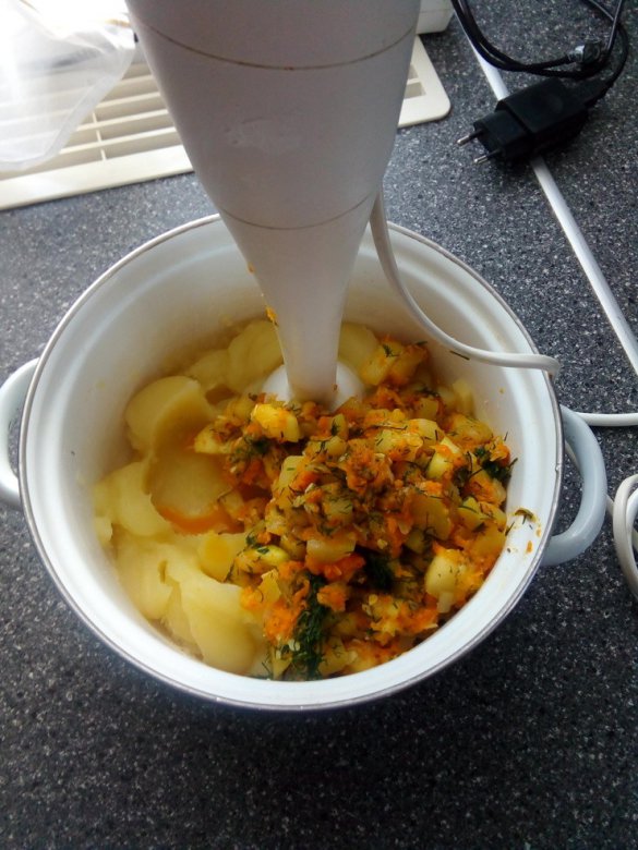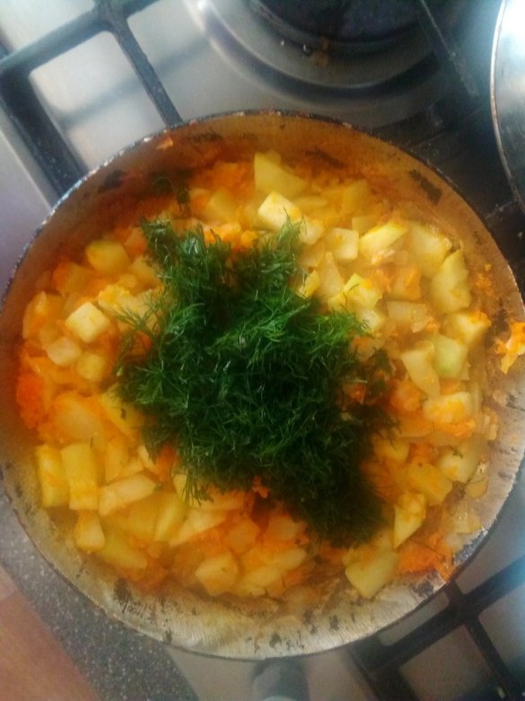 Нужно: - кабачок (1 средний) - картофель (2 шт) - морковь (1 средняя) - лук (1 шт) - зелень (у меня укроп) - сливки 10% (200мл) - соль, специи.