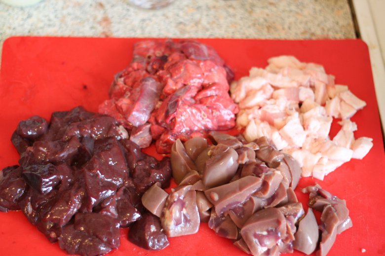 Нарезаем все это добро не самыми мелкими кусками. На фото количество не соответствует реальности, печени гораздо больше. Для сочности добавляем свиной брюшины.
