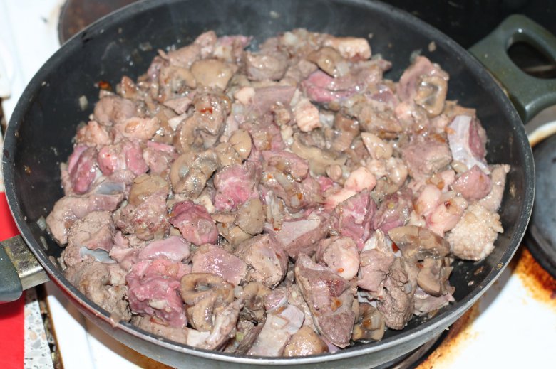 Бланшировать я все это дело поленился, по этому нарезал пару луковиц, чеснока зубчиков 5, слегка обжарил, и закинул следом нарезанный ливер. Все это дело непрерывно помешивая обжариваем до полуготовности.