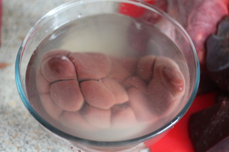 Почку вымачиваем в подсоленной холодной воде часа три, может больше, а то она такая не предсказуемая.
