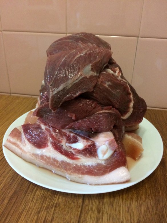 Далее идем на рынок, покупаем мясо - говяжью лопатку и свиную грудинку пожирнее. Всего по килограмму.
