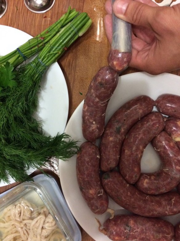 Далее самый интересный процесс: одел свиную чреву (36-38 мм) на кончик шприца, засунул полученную субстанцию в пресс и начал крутить колбаски