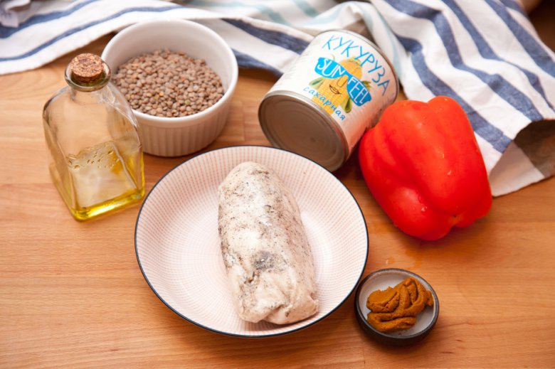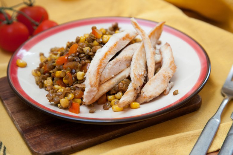 Готовую чечевицу с овощами подавать с нарезанной полосками и обжаренной отварной куриной грудкой. Приятного аппетита!