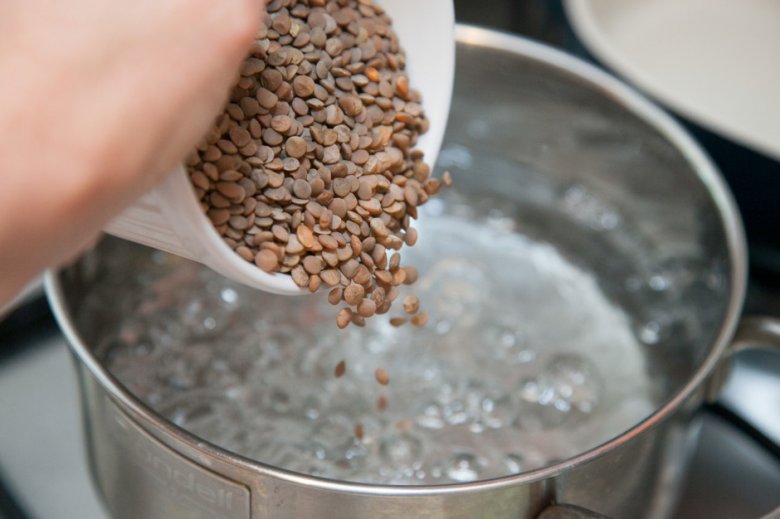 В кастрюлю налить 1 л воды, посолить, довести до кипения, всыпать чечевицу и варить 12-15 минут (до готовности). Затем слить воду.