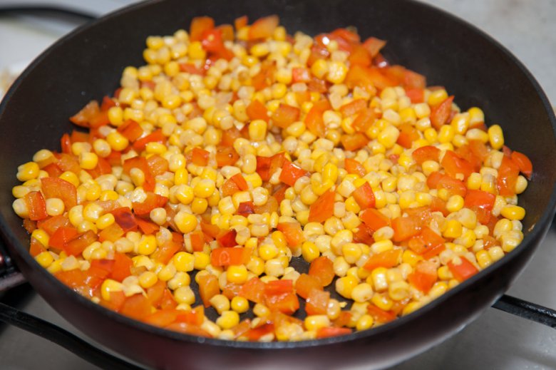 В разогретой с маслом сковороде обжарить до румяной корочки перец, добавить кукурузу.