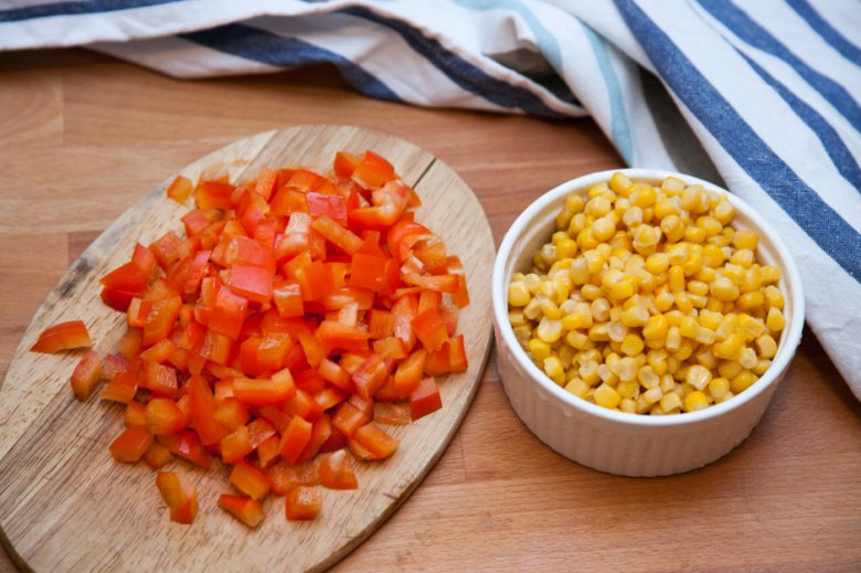Болгарский перец очистить и нарезать кубиком со стороной 5 мм. Кукурузу выложить из банки, слить жидкость.