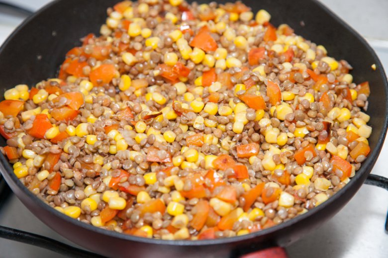 Добавить отварную чечевицу и карри пасту по вкусу, перемешать и жарить, периодически помешивая, еще 3-4 минуты.