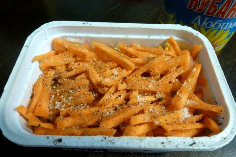Пятый слой — морковь. Поперчить и посыпать щепоткой сахара. Полить нерафинированным подсолнечным маслом. Закрыть контейнер и поставить в холодильник.